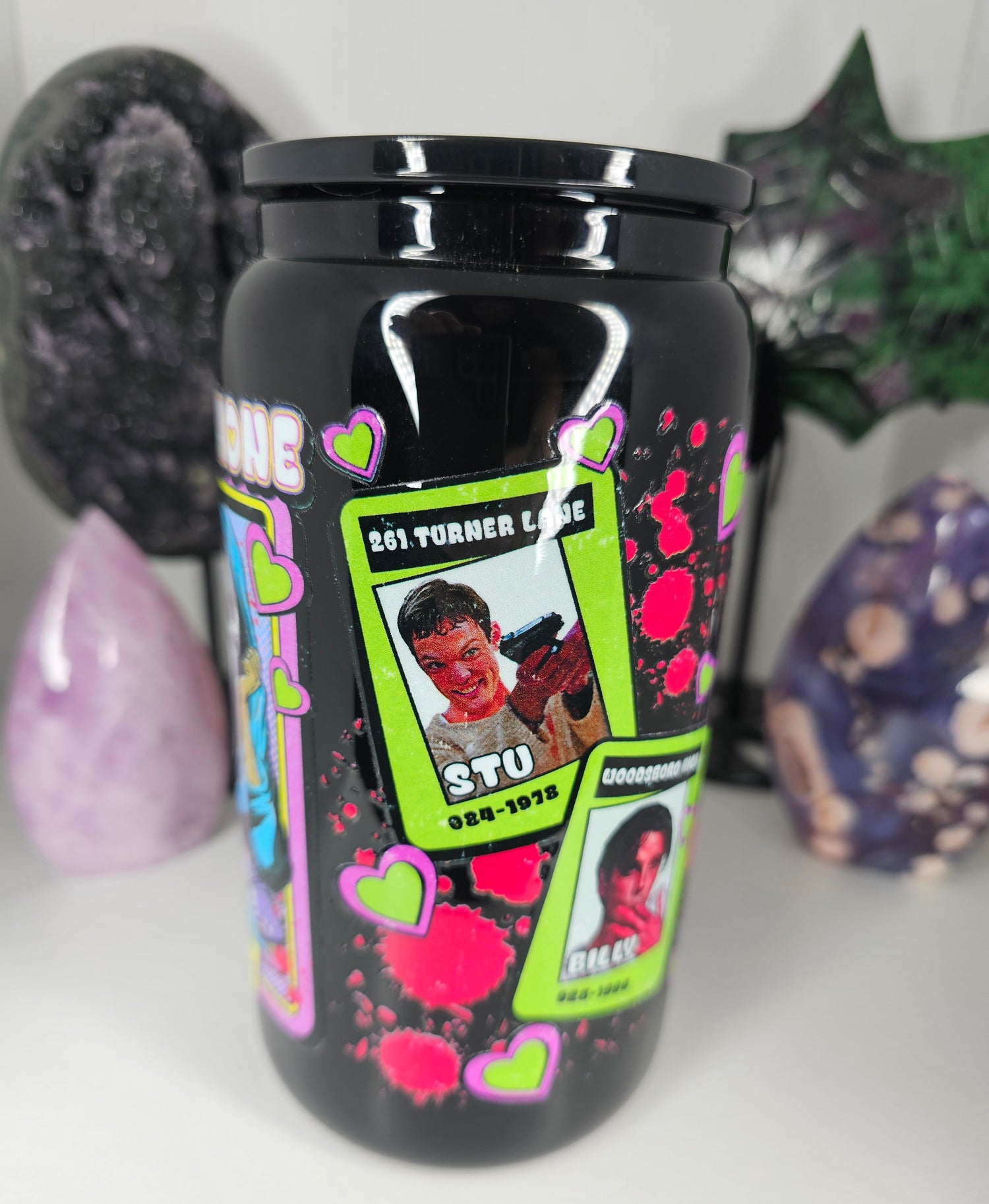Scream inspired 16 Oz Glass Cup. This is a UVDTF print on a 16oz Black Glass cup with Acyrlic lid. Every cup comes with a reusable straw.